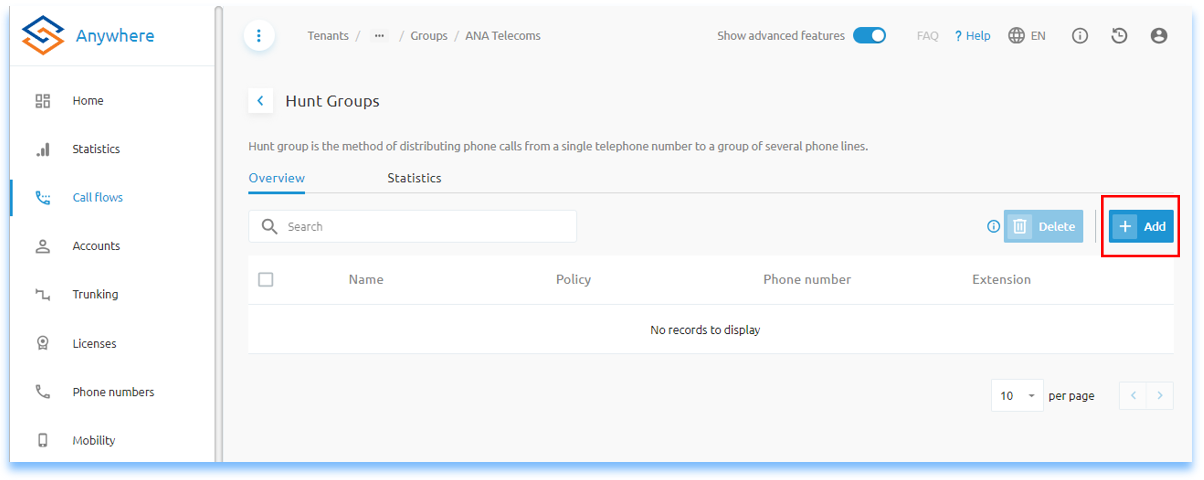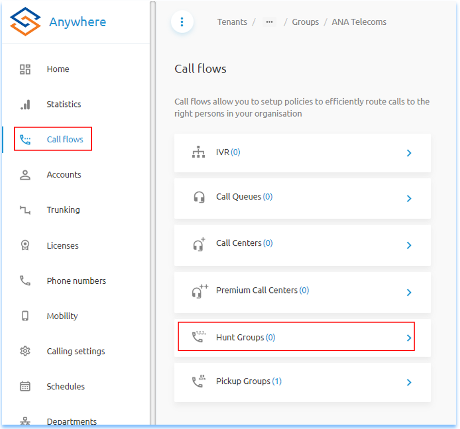 To add a Hunt Group, click on Call Flows from the side menu, then Hunt Groups.