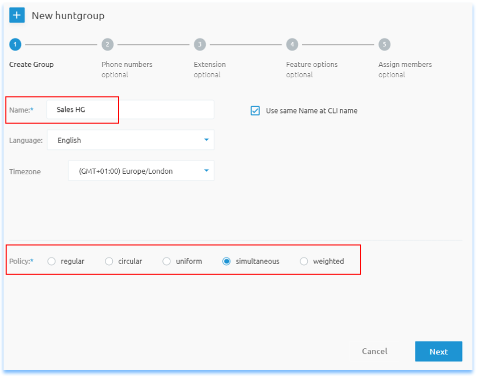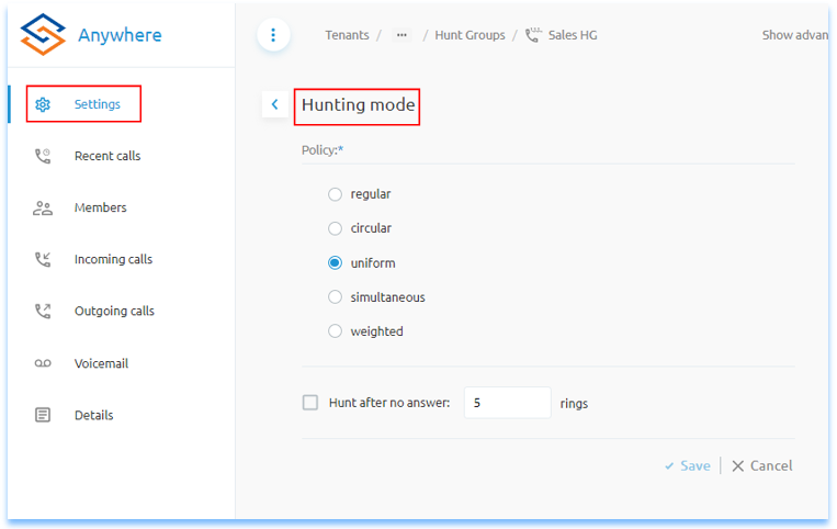 Set the Policy for call routing to users within the Hunt Group. See Huntgroup Policy Settings for more detail.