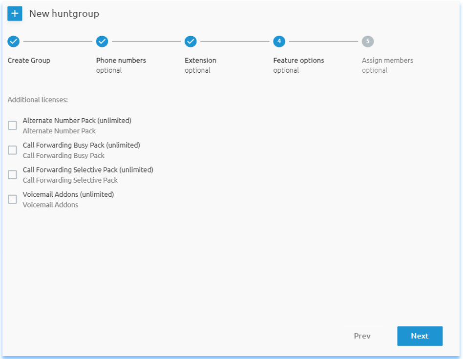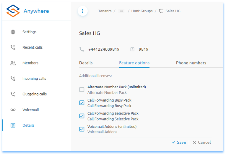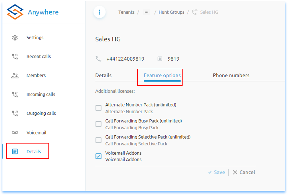 If Voicemail was not selected when creating the huntgroup, Voicemail Addons can be selected in the huntgroup under Details, Feature Options.