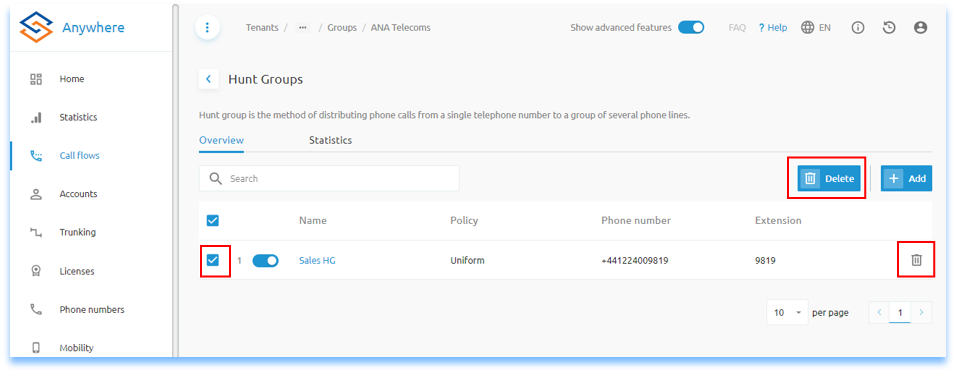 To delete a huntgroup, either select the check box next to the huntgroup and press the Delete button, of press the trash icon next to the huntgroup required to delete.