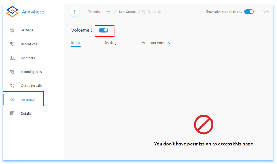 Note: the Inbox by default will show you do not have permission to access this page, this is due to the logged in user not being the owner of the mailbox to see Visual Voicemail.
