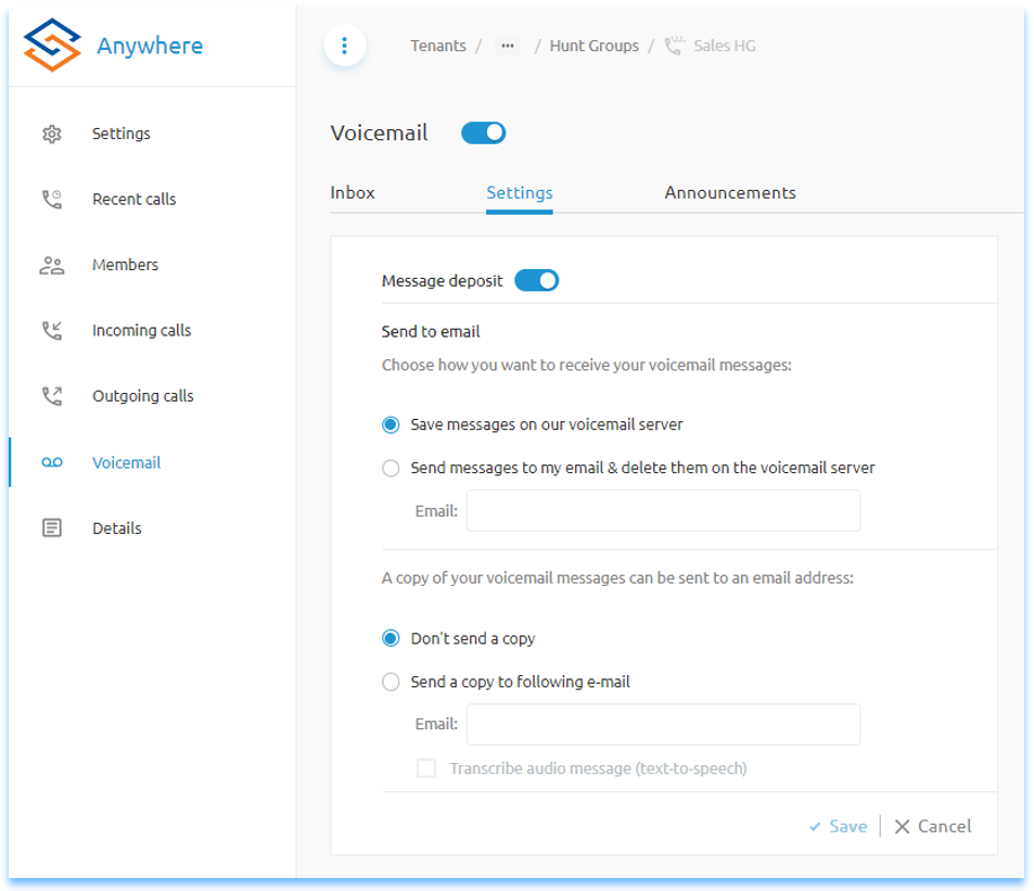 Alternatively, if keeping the voicemail on the server, you can send a copy of the voicemail to an email address. Or if choosing to send the email initially to an email address, a second email address can be used on copy to send to.