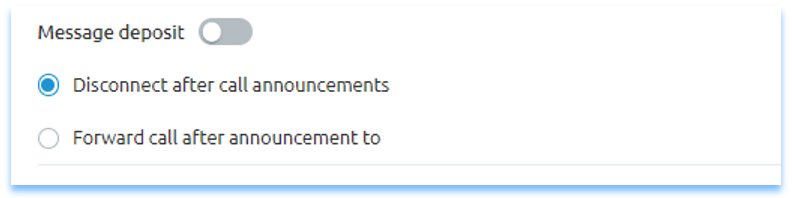 To disable the Message Deposit, select the toggle button. This will stop messages being allowed to be recorded. Use this option when you just want to play an announcement to the caller. When toggled to the off position, two additional options are available to select. By default the call is disconnected, but its also possble to forward the call after the announcement is played to another extension/DDI.