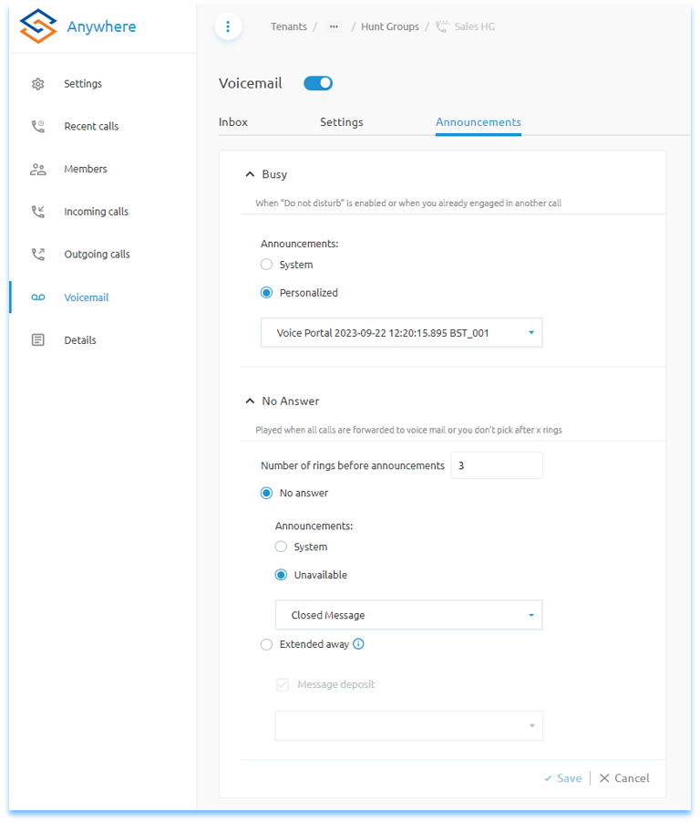 By default, the system audio will play for Busy and No Answer calls. To change the announcement select Personalized or Unavailable options to choose the announcement required. Announcements are saved in the group main side menu under Media.