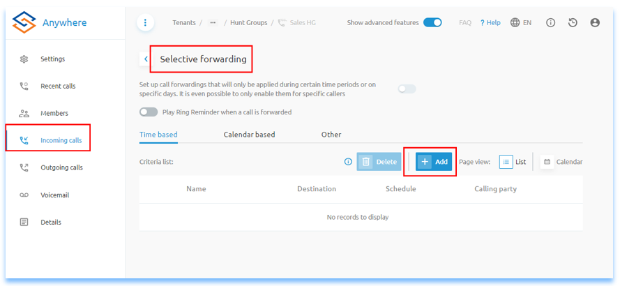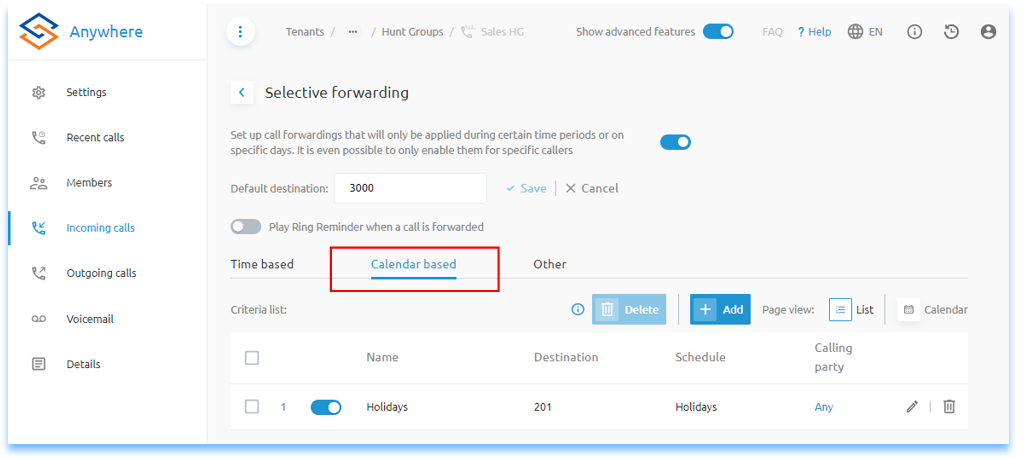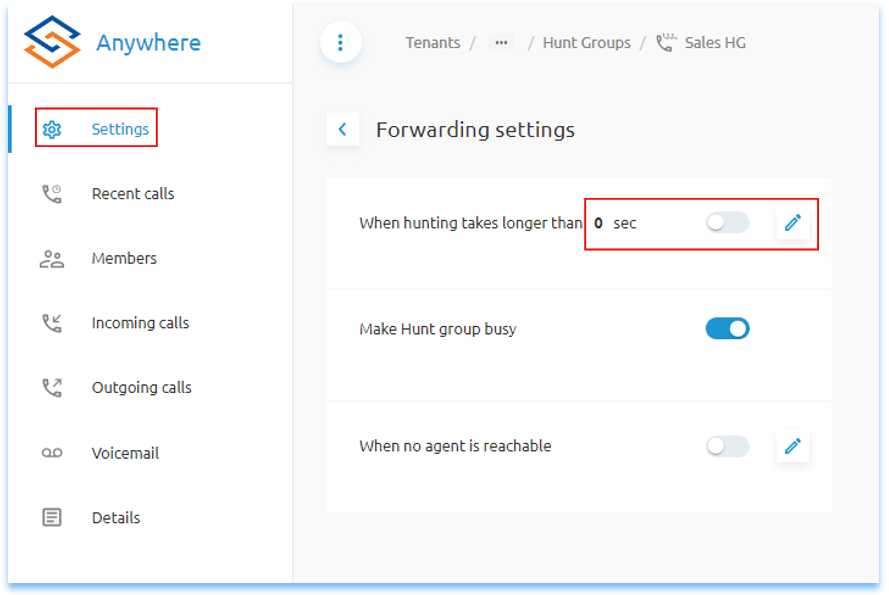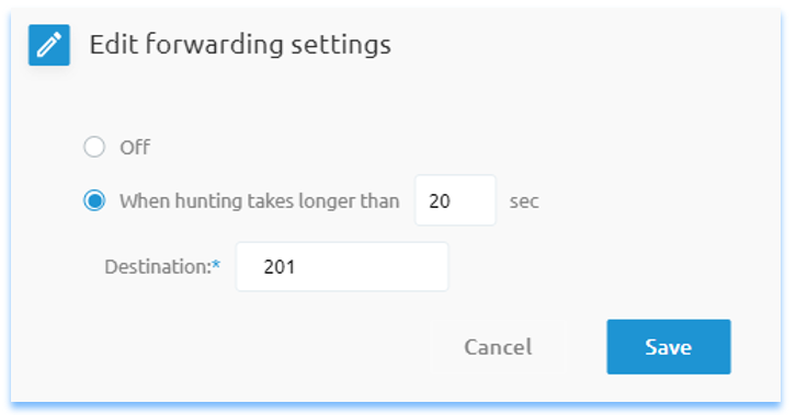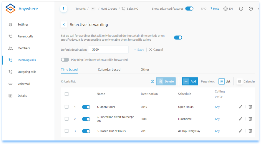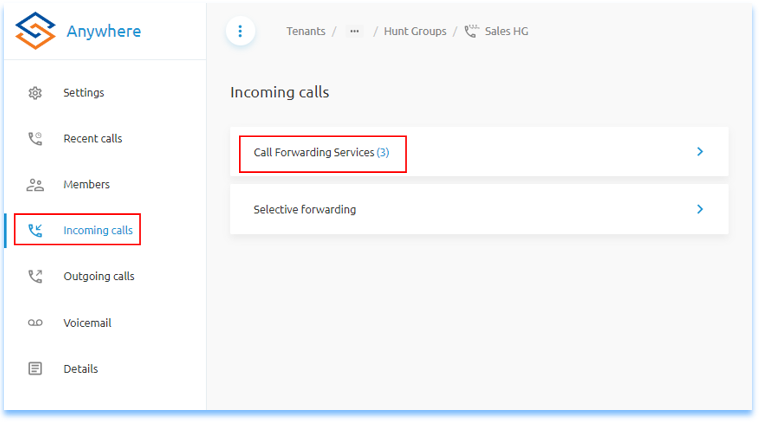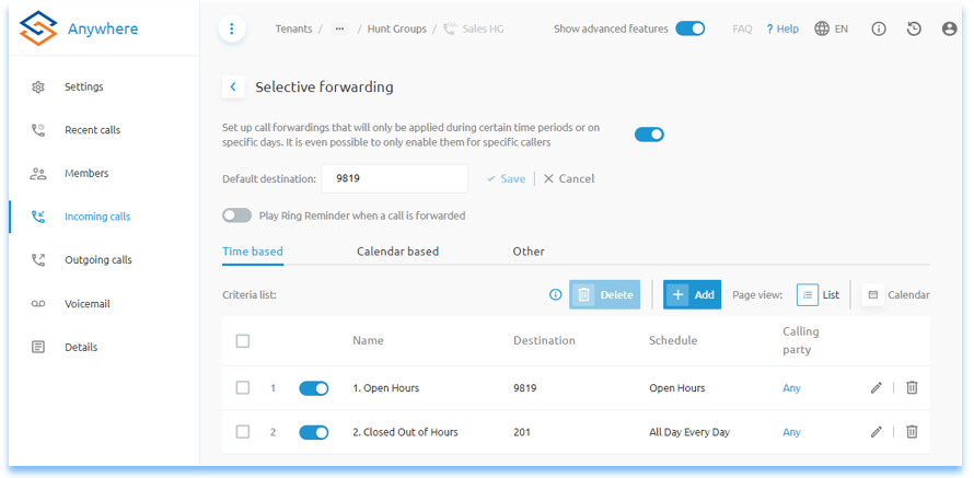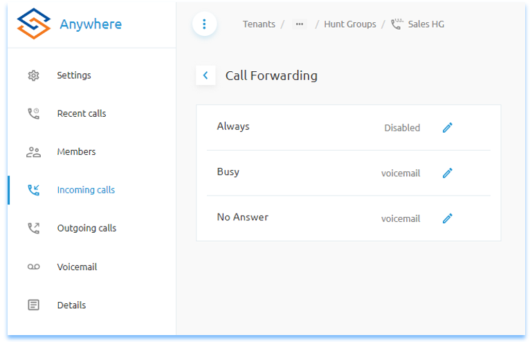 For Incoming Calls, Call Forwarding Services can be set within the huntgroup. These include Always, Busy & No Answer. By default Always is disabled, Busy & No Answer are set to go to voicemail after X rings. These can also be disabled where required.
