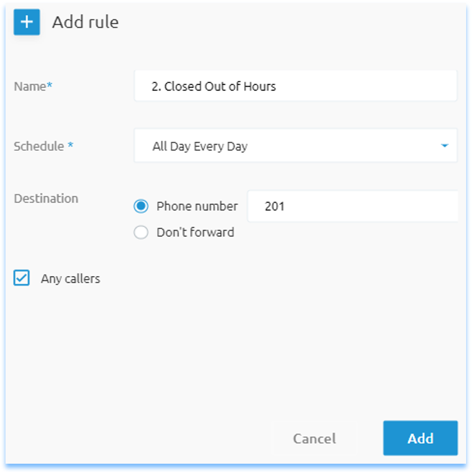 Click Add to create the first schedule. The first rule created will create the Default Destination number once saved. It is recommended that this first rule is capture all rule, for instance when the call flow is closed. Using a All Day Every Day schedule will ensure this rule is always used unless specified with a rule that overrides this rule.