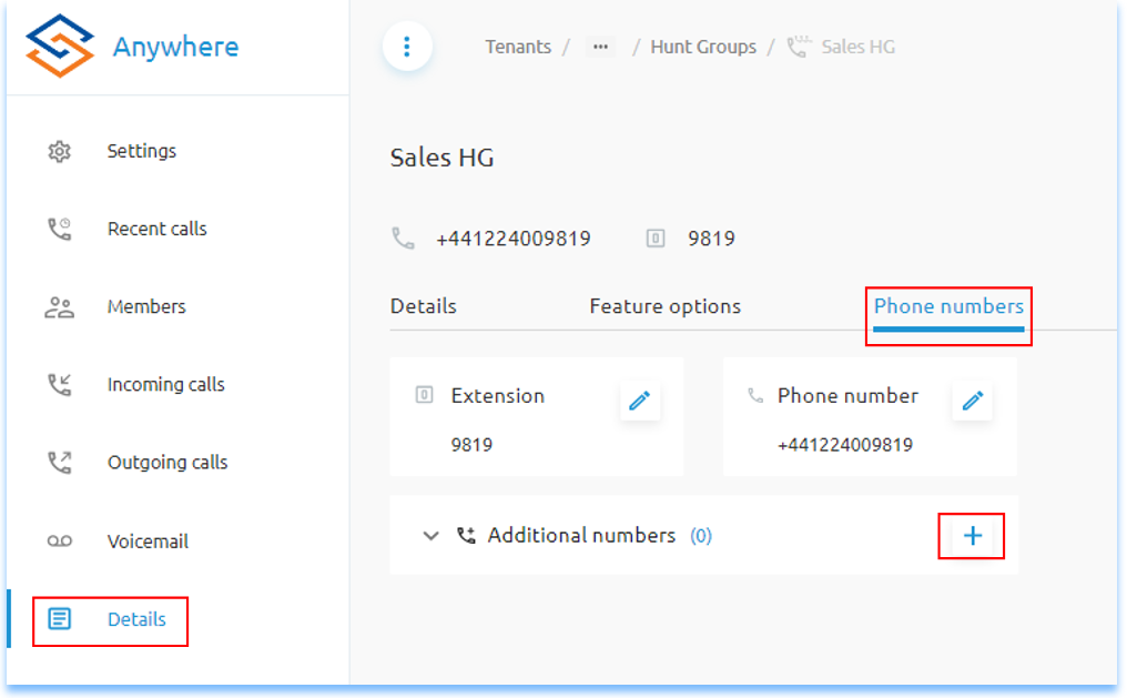 Where a huntgroup has more than one DDI to call, the additional DDIs can be added to Alternative Numbers in Details, Phone Numbers. Click the plus symbol to add the additional numbers. Ensure the numbers added have also been activated, see related articles.
